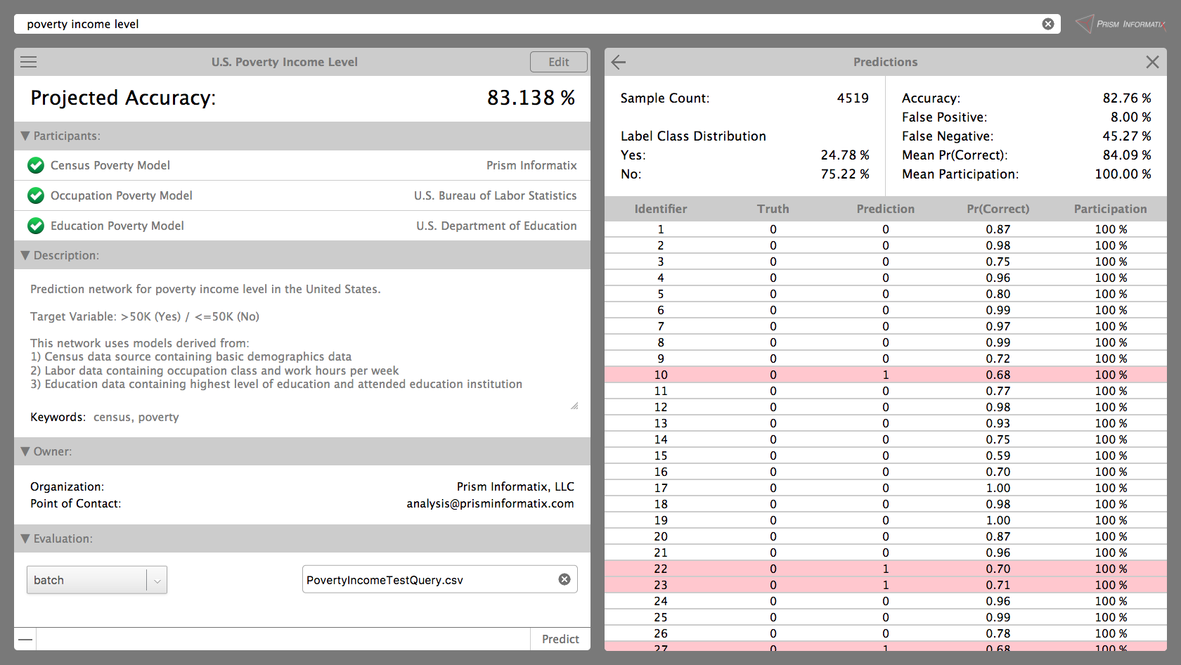 Within the same Collaborative Analytics web application, prediction networks created across the platform are queried by the data analyst to generate predictions. Prediction results from the network are then collected by the web application and visually displayed to the analyst. For test datasets with labeled truths, the Prediction Network Query web application computes the resulting performance over the dataset. This supports rapid testing and comparison of different prediction networks answering the same business query with different combinations of participating data sources, all using the same test dataset.